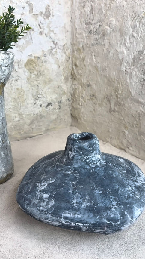 Os vasos são modelados em argila natural misturada a outros substratos minerais, que permitem a textura e o visual rústico, envelhecido.
