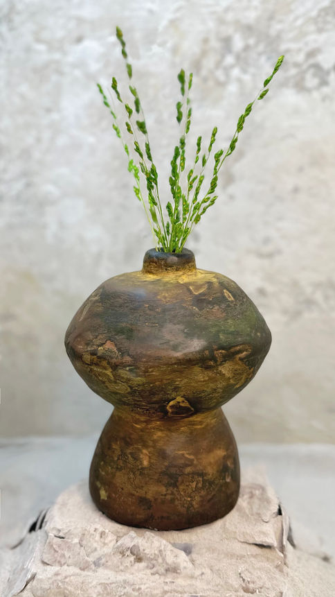 Os vasos são modelados em argila natural misturada a outros substratos minerais, que permitem a textura e o visual rústico, envelhecido.